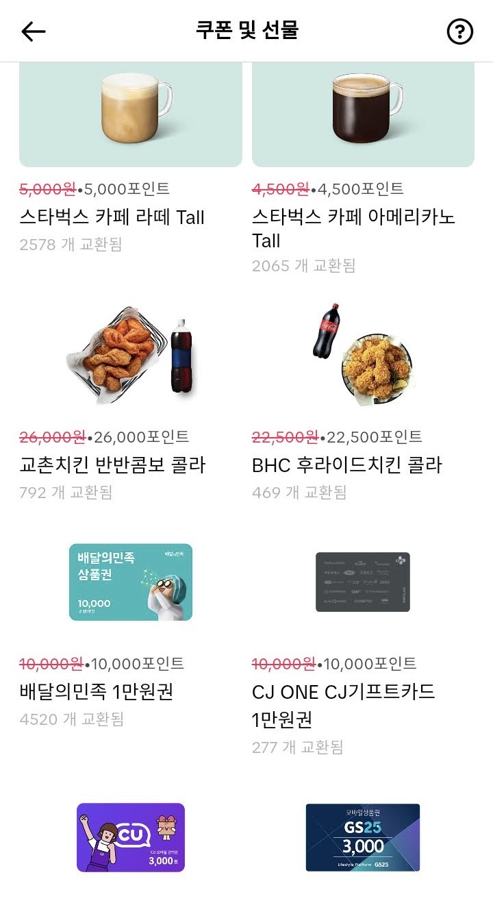 스타벅스,배달의민족,gs25 같은 편의점 상품권들이 있다.